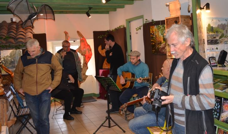 une démonstration de sculpture à la gouge et au tour, ou chacun, sur les conseils avisés de l’artiste, a pu s’essayer à ces techniques qui requière un sens artistique et une rigueur professionnelle. Ce moment convivial s’est organisée autour des musiques aux influences trad’ de Thibaut LOUVET, guitariste au répertoire inépuisable, qui a animé la soirée de sonorités rythmées, de reels irlandais, de bourrées, de mélodies tziganes ou latinos, … accompagné en bœufs de musiciens amateurs.